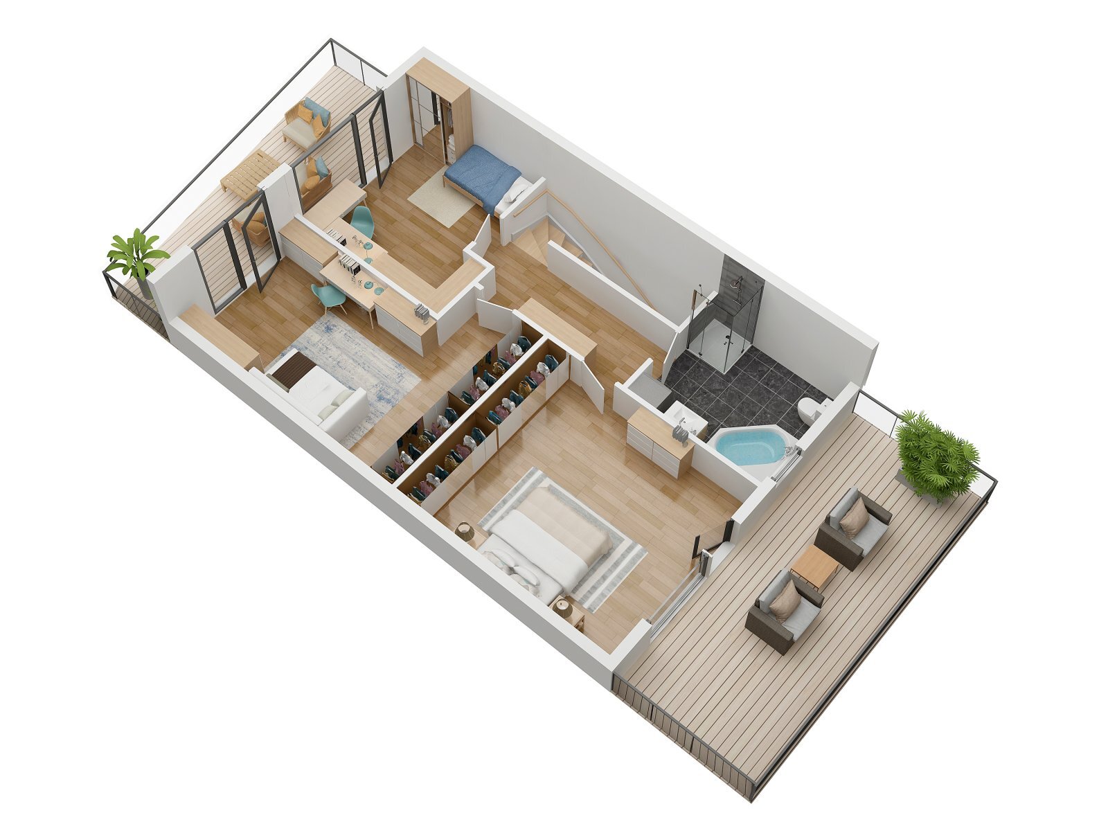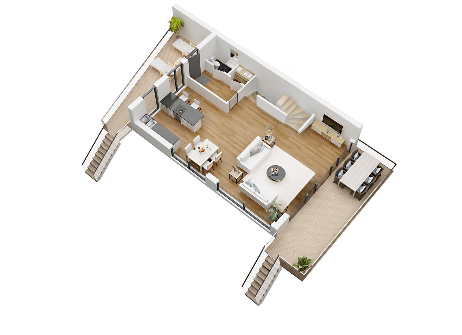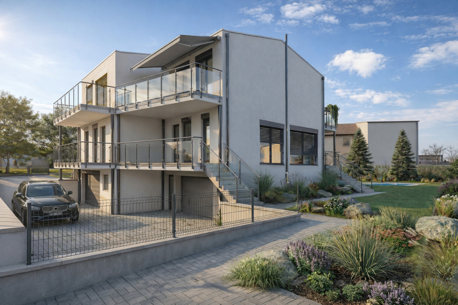 přes částečně zapuštěnou terasu, která poskytuje dostatek soukromí pro