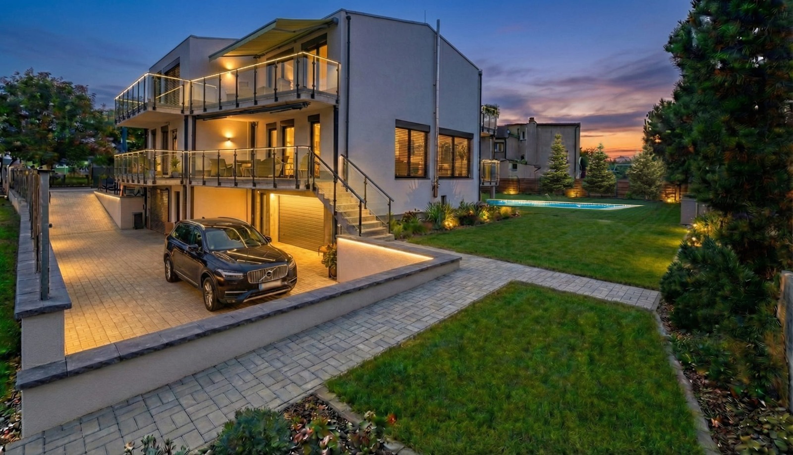 zahradou o výměře 341 m² s bazénem. Celková plocha pozemku činí