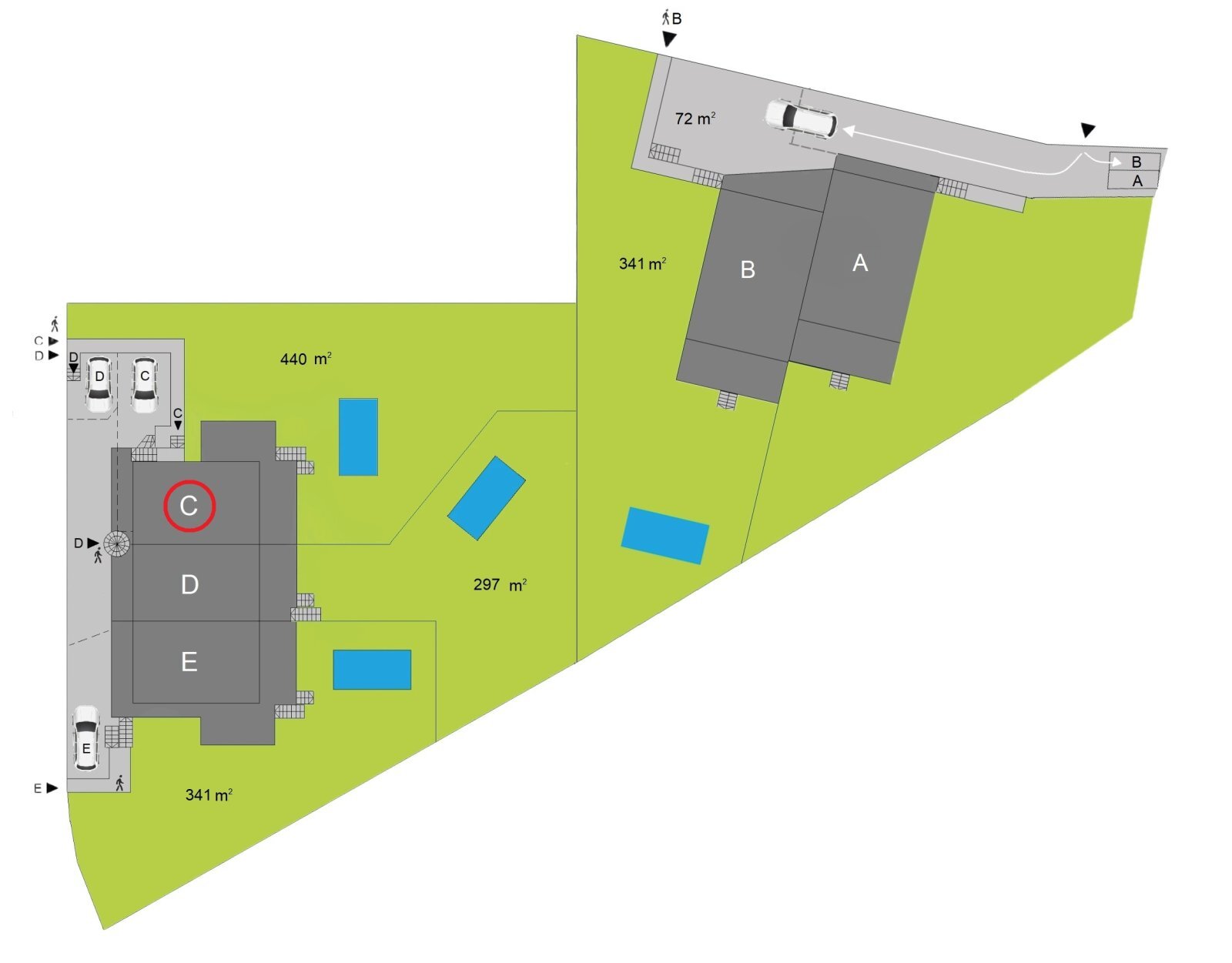 garáž pro 2 auta (22,9 m²), 1 venkovní parkovací místo a soukromou