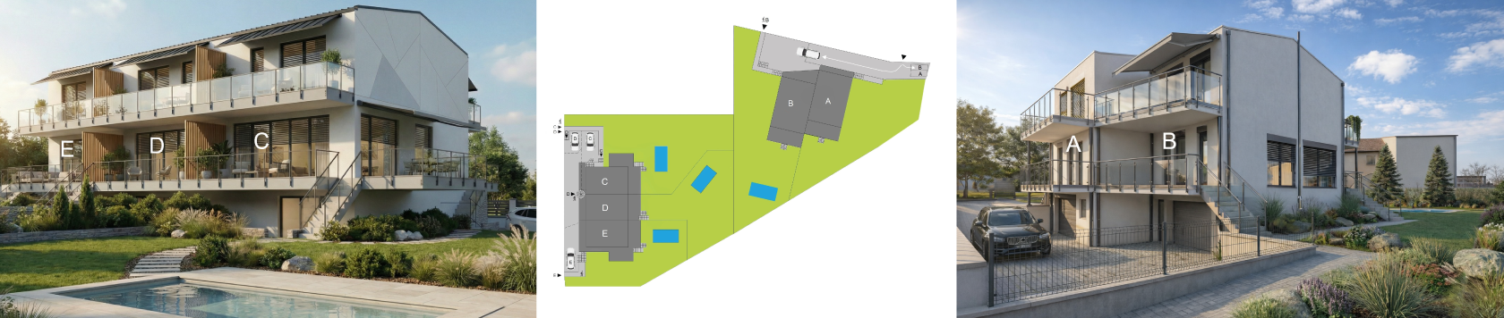 Projekt tvoří komorní soubor pěti třípodlažních vilových mezonetů umístěných ve dvou samostatných domech. V prvním se nacházejí dvě bytové jednotky (mezonety A a B), ve druhém tři bytové jednotky (mezonety C, D a E).